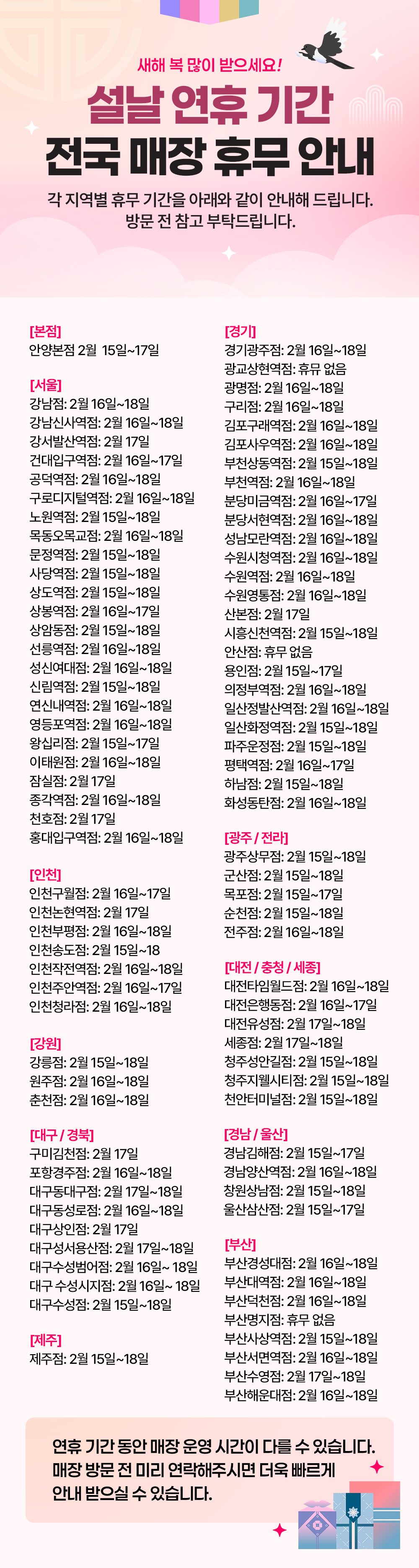 2026 설날 연휴 기간 전국 매장 휴무안내