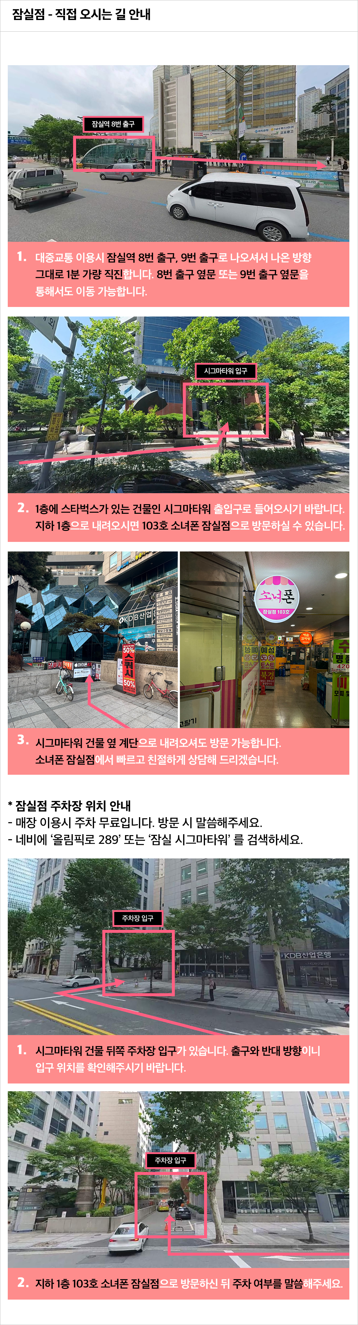 잠실역 8번,9번 출구 30초 거리 서울시 송파구 올림픽로 289 잠실시그마타워 지하1층 103호